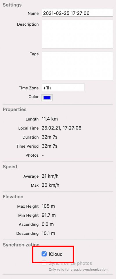 myTracks has got iCloud support both for the Mac and the iOS variants. When iCloud support is active myTracks synchronizes GPS tracks between all your iCloud enabled devices. On the Mac you can decide on a per-track basis whether a track is copied to iCloud or not. If iCloud support is enabled on an iOS device all tracks are copied to iCloud automatically.