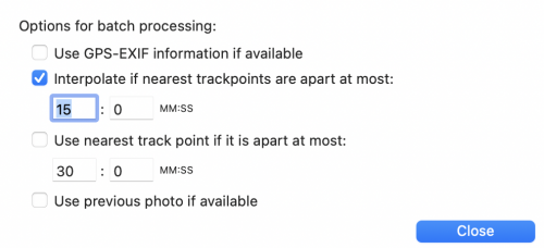 Here you can define when and how a photo is assigned to a track point. For example, you can specify that a photo should be assigned to the closest tracking point if the time span to this tracking point is below the defined limit value.